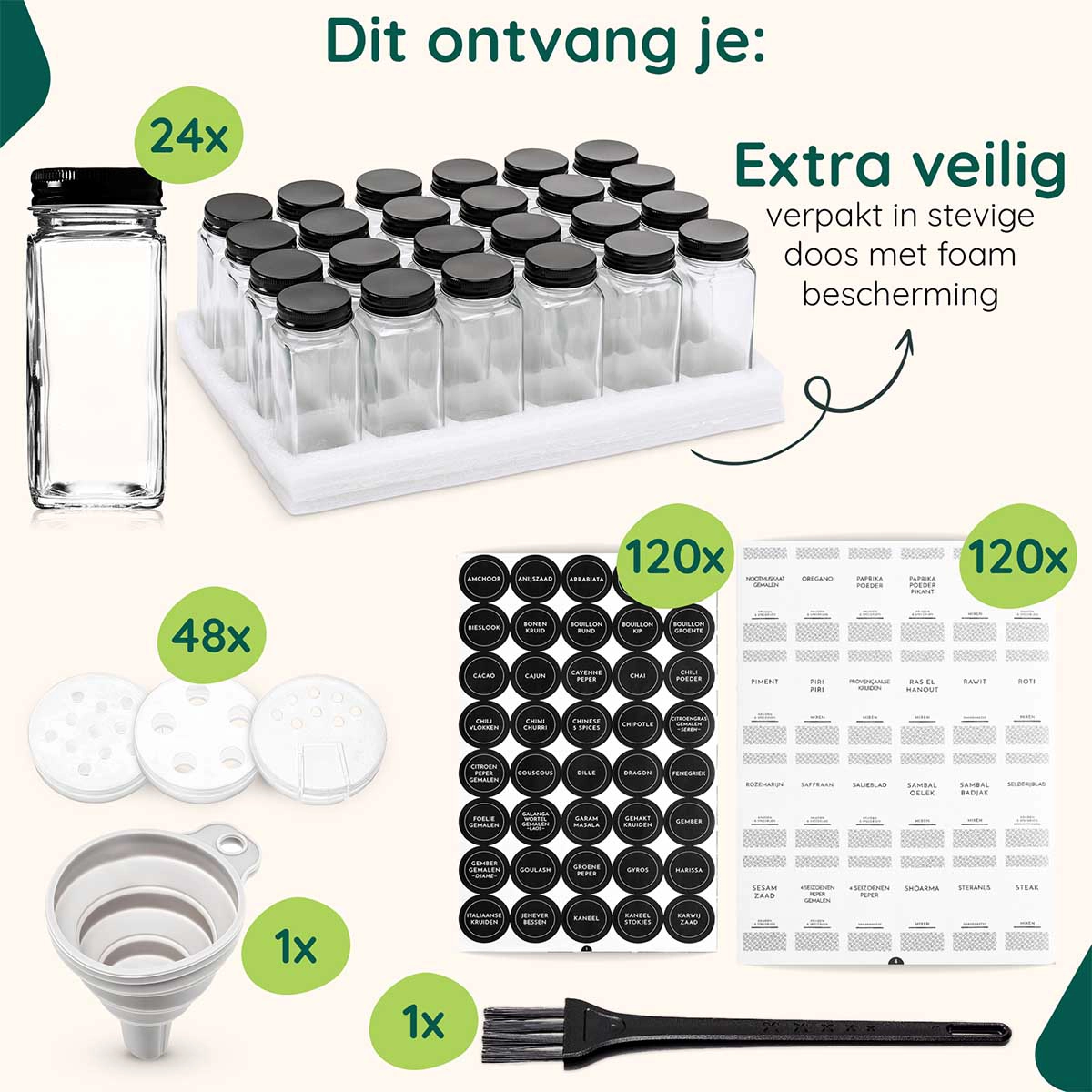 Door de transparante, glazen potjes zie je precies hoeveel kruiden je nog hebt. Met het vierkante ontwerp glijden ze niet zomaar uit je hand!