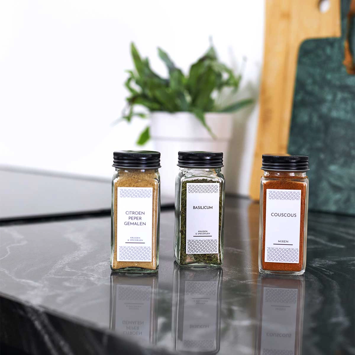 Met maar liefst 120 labels zitten de meest gebruikte kruiden erbij. Kies uit de ronde labels voor bovenop de deksel of de rechthoekige voor op het kruidenpotje. Zit jouw favoriete kruid of rub er niet bij? Dan schrijf je ‘m eenvoudig op een leeg label.