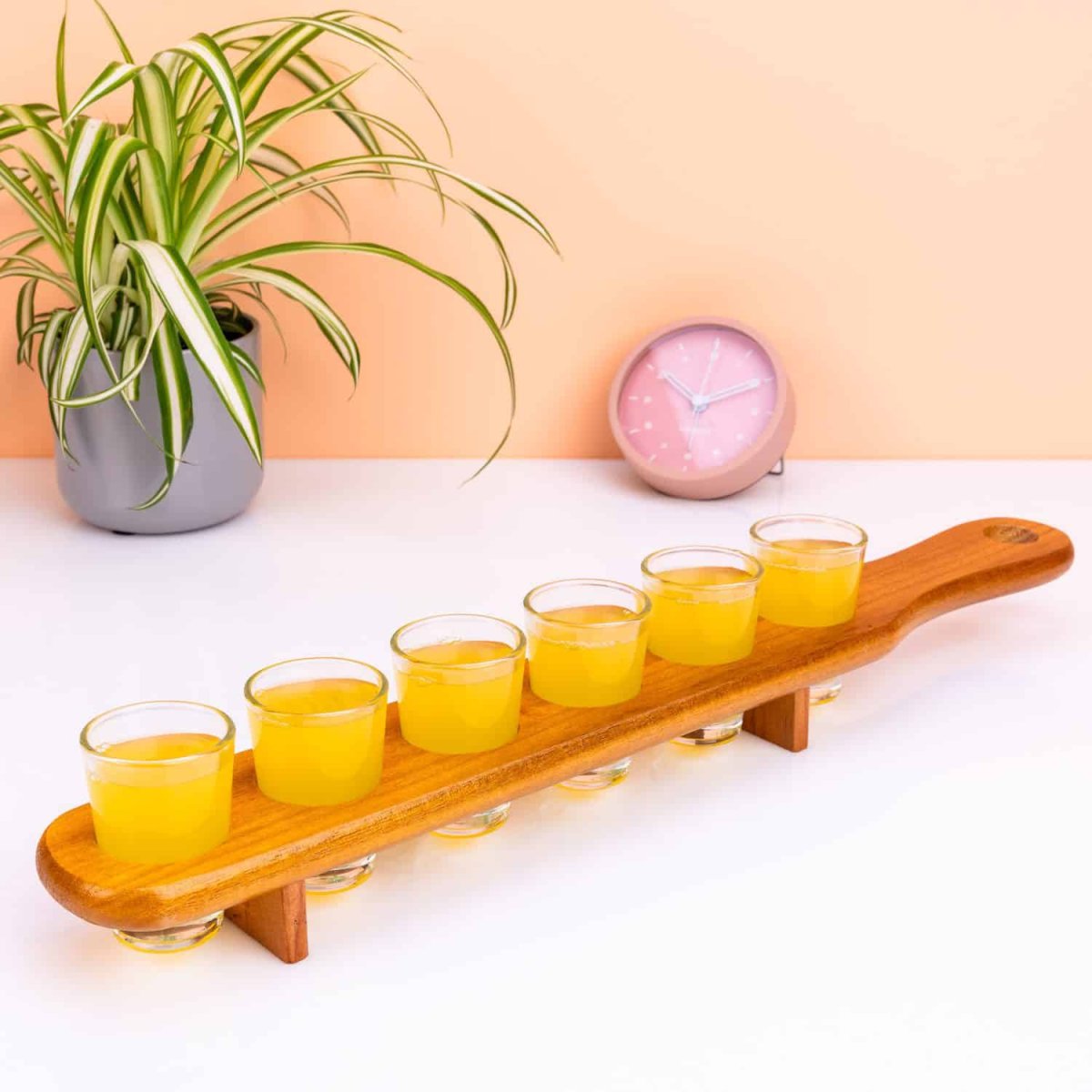Zes shotjes in één hand houden? Een eitje, als je de Zes shotglaasjes op serveertray van Out of the Blue hebt. Een handige houten houder met handvat, waar zes shotglaasjes op staan. Zo hoef je maar één keer naar de keuken te lopen om al je vrienden van een shotje te voorzien. Ideaal voor feestjes!