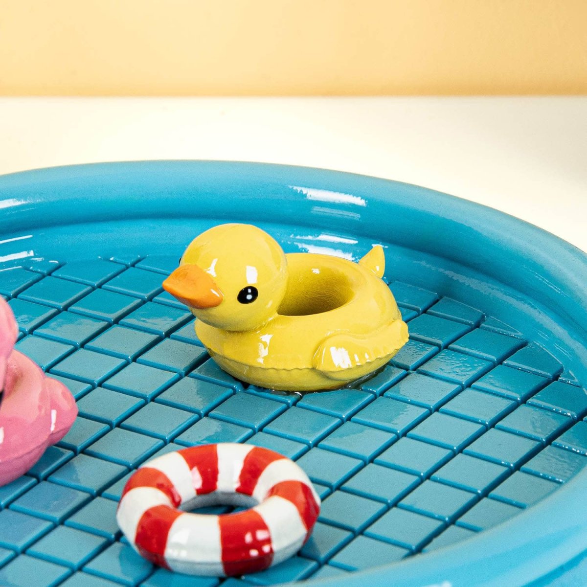 Met het Zwembad sieradenschaaltje van Bitten is het niet alleen makkelijk om je sieraden terug te vinden, het staat nog vrolijk ook. Dit schaaltje is perfect voor je kleine schatten: van piercings en oorbellen tot je sleutelbos. Het sieradenschaaltje lijkt op een zwembad: er drijven zelfs zwembanden in!